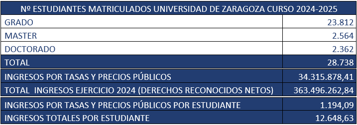 En esta página se muestran los datos de estudiantes matriculados e ingresos por estudiante durante el curso 2024/2025 en la Universidad de Zaragoza. Estos datos se obtienen de los informes que se incluyen en la Memoria Económica, que se emite cuando se cierra el año económico, hacia el mes de mayo.